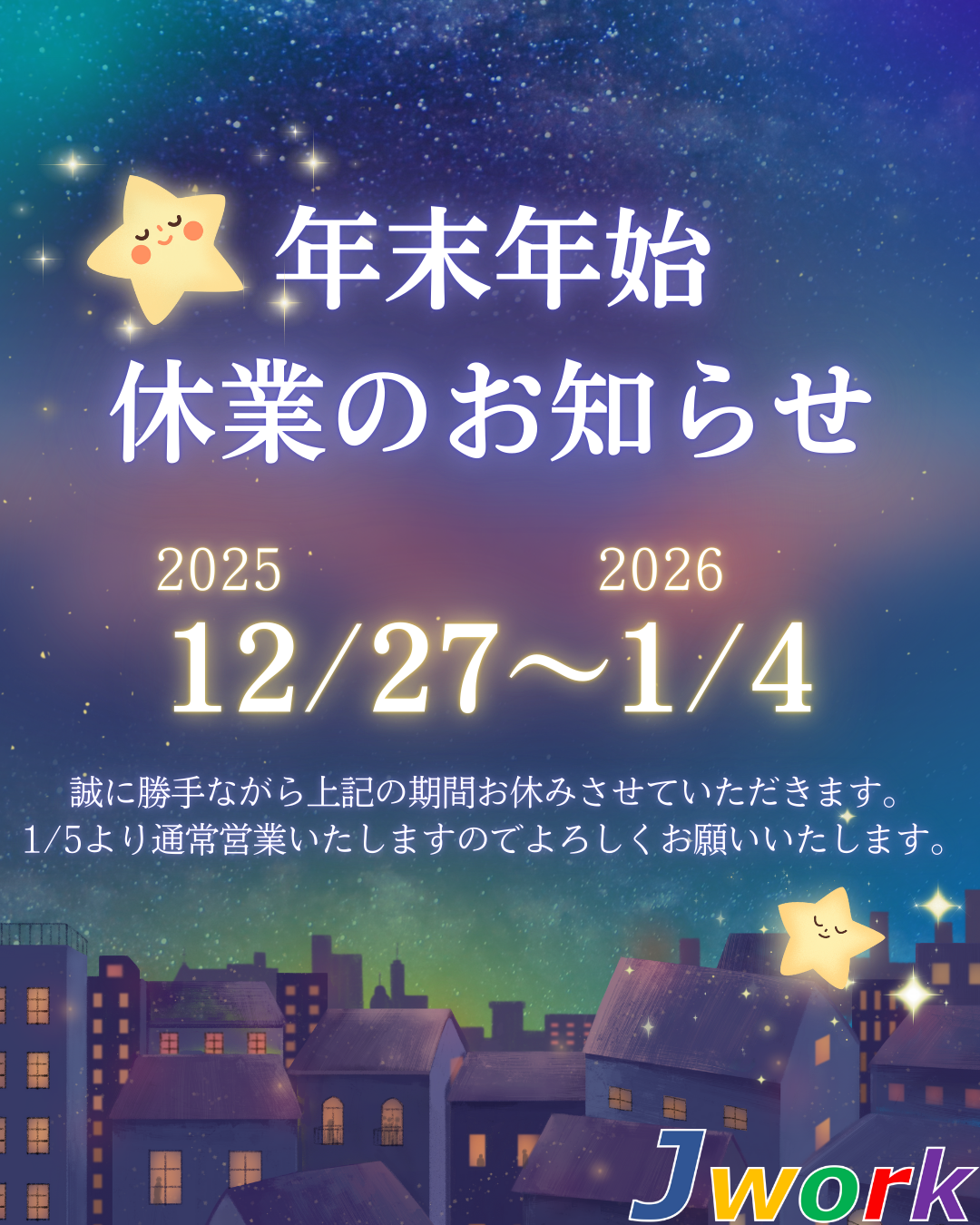 • ~お知らせ~ 平素よりJworkのご利用ありがとうございます。誠に勝手ながら、12...
